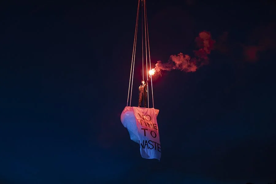 High above, suspended by a crane, a figure isolated on three tonnes of melting ice struggles for balance. As sunset approaches what will be left?